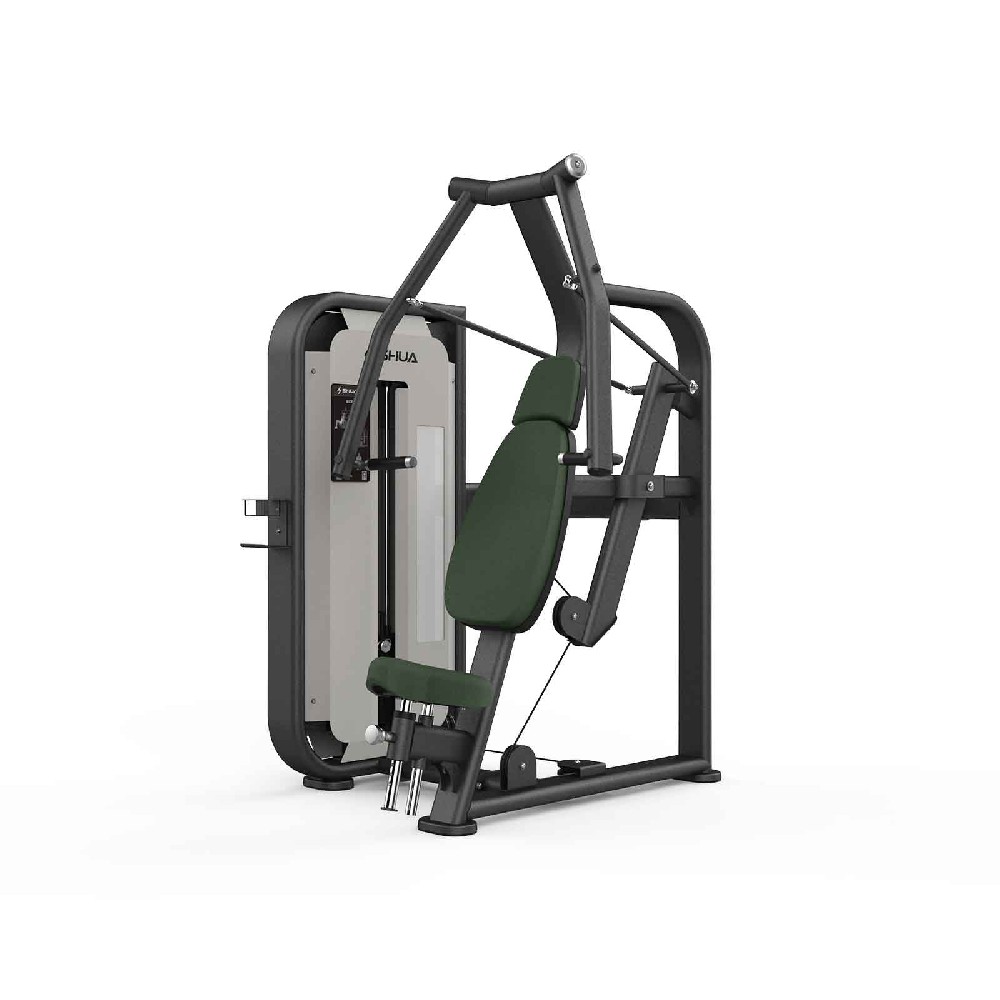主要功能 锻炼胸大肌、三角肌前束、肱三头肌1、阻力形式:配重块;总重90kg;最小调节重量5kg2、垫类(坐/背/胸/肘垫):坐垫高度可调节;PU发泡成型3、最大人体承重:150kg4、主要管材规格:龙门架平椭150502.0mm,副架平椭120502.0mm5、牵索形式:日本进口钢丝绳;¢5.6mm6、轴承:人本轴承;60067、滑轮:尼龙加